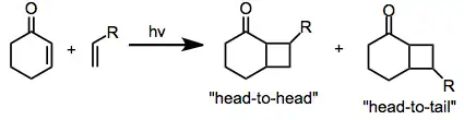 Enone–alkene cycloadditions can produce two isomers, depending on the orientation of substituents on the alkene and the enone carbonyl group. When the enone carbonyl and substituent of highest priority are proximal, the isomer is termed "head-to-head." When the enone carbonyl and substituent are distal, the isomer is called "head-to-tail." Selectivity for one of these isomers depends on both steric and electronic factors (see below).