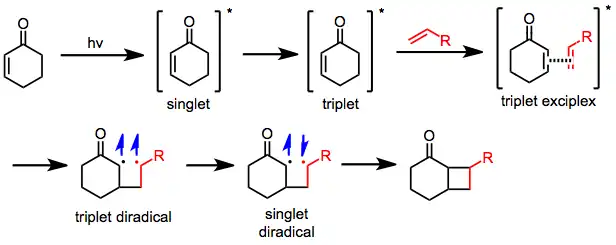 The mechanism of [2+2] photocyclization is proposed to begin with photoexcitation of the enone to a singlet excited state. The singlet state is typically very short lived, and decays by intersystem crossing to the triplet state. At this point, the enone forms an exciplex with the ground state alkene, eventually giving the triplet diradical. Spin inversion to the singlet diradical allows closure to the cyclobutane.[5] As an alternative a pericyclic reaction mechanism is proposed, in which after intersystem crossing a radical cation and a radical anion are formed, which then recombine to the cyclobutane.[6]