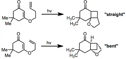 Intramolecular enone–alkene cycloaddition may give either "bent" or "straight" products depending on the reaction regioselectivity. When the tether between the enone and alkene is two atoms long, bent products predominate due to the rapid formation of five-membered rings.[10] Longer tethers tend to give straight products.[11]