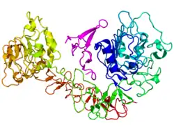 Epidermal growth factor receptor (EGFR) is a transmembrane protein that is activated by binding of its specific ligands, including epidermal growth factor and transforming growth factor alpha (TGF-α).[7] ErbB2 has no known direct activating ligand, and may be in an activated state constitutively or become active upon heterodimerization with other family members such as EGFR. Upon activation by its growth factor ligands, EGFR undergoes a transition from an inactive monomeric form to an active homodimer.[8] – although there is some evidence that preformed inactive dimers may also exist before ligand binding.[9] In addition to forming homodimers after ligand binding, EGFR may pair with another member of the ErbB receptor family, such as ErbB2/Her2/neu, to create an activated heterodimer. There is also evidence to suggest that clusters of activated EGFRs form, although it remains unclear whether this clustering is important for activation itself or occurs subsequent to activation of individual dimers.[10]