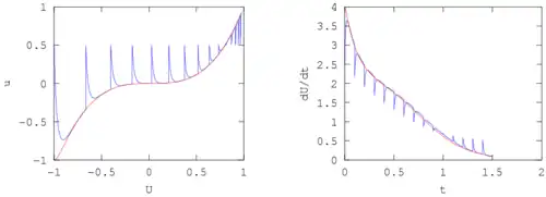 The solution of the differential equation rapidly moves to the slow manifold for any initial data. The coarse time-stepper solution would agree better with the full solution when the 100 factor is increased. The graph shows the lifted solution (blue solid line) . At times , the solution is restricted and then lifted again, which here is simply setting . The slow manifold is shown as a red line. The right plot shows the time derivative of the restricted solution as a function of time (blue curve), as well as the time derivative (the coarse time derivative), as observed from a full simulation (red curve).