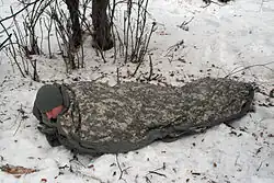 The Modular Sleep System (MSS) is a sleeping bag kit part of the Extended Cold Weather Clothing System (Gen I to Gen III) used by the United States Army and manufactured by Tennier Industries. It consists of a camouflaged, waterproof, breathable bivy cover, a lightweight patrol sleeping bag, and an intermediate cold-weather sleeping bag (note that the color differs depending on the vintage of the gear). Compression sacks are included to store and carry the system. The MSS is available in a variety of camouflage patterns. The patrol bag provides weather protection from 35–50 °F (2–10 °C). The intermediate bag provides cold weather protection from −5–35 °F (−21–2 °C). Combining the patrol bag and intermediate bags provides extreme cold weather protection in temperatures as low as −30 °F (−34 °C). The bivy cover can be used with each of three MSS configurations (patrol, intermediate, or combined) to provide environmental protection from wind and water. The sleeping bags are made of ripstop nylon fabrics and continuous-filament polyester insulation; the camouflage bivy cover is made with waterproof, breathable, coated, or laminated nylon fabric; the compression sacks are made with water-resistant and durable nylon fabrics.[68]