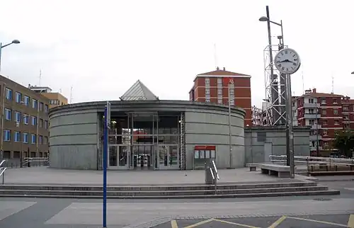 Starting in 1947, the narrow-gauge railway companies that operated within the Bilbao metropolitan area were merged to become Ferrocarriles y Transportes Suburbanos, shortened FTS and the first precedent of today's Bilbao metro. In 1977, the FTS network was transferred to the public company FEVE and in 1982 to the recently created Basque Railways.[4] In the 1980s it was decided the station, just like most of the former railway line, would be integrated into line 1 of the metro. The station, then renamed to simply Erandio, was the first station of the former Bilbao-Plentzia railway to be put underground, as designed by Navarrese architect Francisco Javier Sáenz de Oiza. [5] The new station opened as part of the metro network on 11 November 1995.[6]