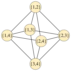 The Johnson graph , with a vertex for each two-element subset of {1,2,3,4} and an edge connecting intersecting pairs of subsets, arranged geometrically as an octahedron with disjoint sets at opposite vertices. The largest intersecting families for and come from the triangular faces of this octahedron. Replacing a set in one of these families by its complement corresponds to moving from a triangle to one of its three neighboring triangles.