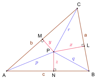 Let the sides of ABC be a opposite A, b opposite B, and c opposite C; also let PA = p, PB = q, PC = r, dist(P;BC) = x, dist(P;CA) = y, dist(P;AB) = z. First, we prove that