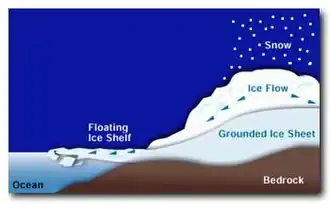 Waters at the glacier tongue that receive the icebergs vary in depth from a minimum of 155–475 metres (509–1,558 ft).[19] Members of Robert F. Scott's Terra Nova Expedition first observed the glacier tongue calving in March 1911 when a 4 km section broke off during a gale.[1] A similar event in March 1990 produced a 100-million ton iceberg, 3.5 km long, from the glacier tongue.[20] In addition, observers note that the glacier tongue experienced a major calving event in the early 1940s.[21] Such calving along the glacier snout naturally leads to shortening, while icebergs released from the glacier tongue sides contribute to the glacier's narrowing. The Erebus Glacier Tongue produces flat-topped or tabular icebergs. It calved most recently in 2013, around a decade earlier than expected.[22]