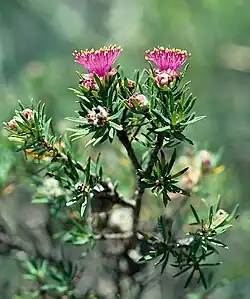 The flowers are pink to deep pink and occur in small groups (usually pairs) on the end of short branches from longer ones formed the previous year. The outer surface of the flower cup (the hypanthium) is densely hairy. There are 5 petals 3.5–4.6 millimetres (0.1–0.2 in) long. The stamens, which give the flower its colour, are arranged in 5 bundles, each containing 19 to 26 stamens. Flowering occurs from October to November and is followed by fruits which are woody capsules. The capsules are more or less urn-shaped, 5.8–7 millimetres (0.23–0.28 in) long with a rough, flaky surface.[2]