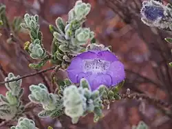 Felty-leaved eremophila is an ideal small shrub for a container or rockery with its silvery foliage and lilac-coloured flowers. It can be propagated from cuttings or grafted onto Myoporum species. Full sun and well-drained soils are preferred and the plant is drought resistant but is killed by frost.[8]