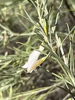 Eremophila dalyana is a shrub or small tree which grows to a height of between 1 and 4 m (3 and 10 ft) and a width of up to 1.5 m (5 ft). It has many erect branches giving the plant a broom-like appearance. Most parts of the plant are covered with silvery or greyish scales. The leaves are erect, arranged in opposite pairs, linear in shape, mostly 13–50 mm (0.5–2 in) long, about 1 mm (0.04 in) wide and have a curved hook on the end.[2][3][4]