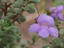 Eremophila flabellata is a flowering plant in the figwort family, Scrophulariaceae and is endemic to Western Australia. It is a small shrub with serrated leaves, broad serrated sepals and pink, purple or mauve flowers.
