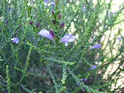 The flowers are borne singly in leaf axils on a stalk less than 1.5 mm (0.06 in) long. There are 5 narrow, tapering, green sepals which are 2–4 mm (0.08–0.2 in) long. The petals are 7–10.5 mm (0.3–0.4 in) long and joined at their lower end to form a tube. The tube is a shade of lilac to purple with the inside of the petal lobes lilac while the inside of the tube is white spotted with mauve or brown. The outside of the petal tube and lobes are glabrous except for the inside surface of the lower lobe which has long hairs along its centre line and the inside of the tube which is filled with long hairs. Two stamens are enclosed in the petal tube while the other 2 extend slightly beyond its end. The fruits are more or less cylindrical in shape, slightly flattened and 2–3.5 mm (0.08–0.1 in) long.[2][3]