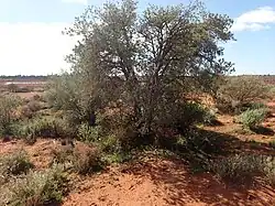 Eremophila miniata, commonly known as kopi poverty bush,[2] or plumridge[3] is a flowering plant in the figwort family, Scrophulariaceae and is endemic to Western Australia. It is an erect shrub with many tangled branches, greyish leaves and flowers which vary in colour, ranging from reddish to yellow or cream.