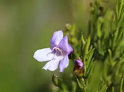 The flowers are borne singly in leaf axils on a sticky, hairy stalk 3.5–7 mm (0.1–0.3 in) long. There are 5 overlapping, sticky, hairy sepals which are 3–6.5 mm (0.1–0.3 in) long and egg-shaped to lance-shaped. The petals are 8.5–20 mm (0.3–0.8 in) long and are joined at their lower end to form a tube. The petal tube is dark purple to lilac-coloured or blue, rarely white on the outside and white with faint lilac-purple spots inside. The outer surface of the petal tube and lobes and the inner surface of the lobes are glabrous but the inside of the tube is filled with long, soft hairs. The 4 stamens are fully enclosed in the petal tube. Flowering occurs in August and the fruits which follow are dry, cone-shaped, rather woody, rough and 4–5 mm (0.16–0.20 in) long.[2][3]