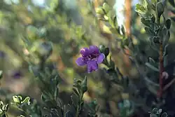 Eremophila platythamnos, commonly known as desert foxglove, is a flowering plant in the figwort family, Scrophulariaceae and is endemic to Australia. It is an erect shrub with short, broad leaves and purple, mauve, blue or pink flowers.