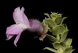 The flowers are borne singly in leaf axils on a hairy stalk 9–28 mm (0.4–1 in) long. There are 5 green to purple, overlapping, egg-shaped to lance-shaped sepals which are mostly 5–10 mm (0.2–0.4 in) long and which end in a spine. The petals are 20–35 mm (0.8–1 in) long and are joined at their lower end to form a tube. The petal tube is lilac-coloured, purple or violet on the outside, while the inside of the tube and lower part of the lobes are whitish with reddish-brown spots. The outside surface of the tube and petal lobes is hairy but the inside surface of the petal lobes is glabrous while the tube is filled with long, soft hairs. The lower lobe is often pushed up and closes the opening of the petal tube. The 4 stamens are fully enclosed in the petal tube. Flowering occurs from June to August and is followed by fruit which are dry, woody, oval-shaped, about 7–12 mm (0.3–0.5 in) long and have a hairy, papery covering.[2][3]