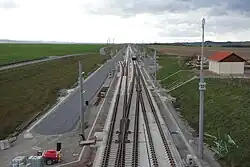 In January 2009, Deutsche Bahn called construction tenders for the subgrade of the ballastless section 2 (track-km 197.889 to km 215.937) and the ballastless section 3 (km 215.937 to km 228.685). Both contracts were to run from June 2009 to the end of April 2012.[50][51] At the end of May 2009, this was followed by the invitation to tender for the contract for the ballastless section 4 (km 251.1 to km 272.1) as well as the ballastless section 5 including the Gröbers junction (km 279.9 bis km 286.9). These contracts were to run from November 2009 to November 2012 (lot 4) and from July 2010 to December 2015 (lot 5).[52][53][54] In July 2009, finally, the integration of the line into the Erfurt junction was tendered, which would be built between December 2009 and December 2010.[55] In July 2011, a contract worth €200 million was awarded for the production of slab track and for 22 kilometres (14 mi) of noise and wind barriers between Erfurt and Gröbers. This work would be completed by the end of 2013.