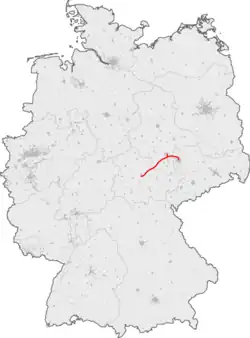 The line towards Leipzig adopts a course without major engineering structures.[2] In Gröbers, it has a grade-separated crossing over the tracks of the Mitteldeutschland S-Bahn and the Magdeburg-Leipzig Railway and there are connections between these lines at Gröbers junction.[3] Before reaching Leipzig/Halle Airport, which has two outside platforms, it passes over Autobahn 9 on a bridge near the Schkeuditz Cross interchange (Schkeuditzer Kreuz). The line runs next to Autobahn 14 for nearly 13 km (8.1 mi) (kilometres 290–303) before turning off the A14 to approach Leipzig Messe station. After another six kilometres of upgraded line (Ausbaustrecke), the line ends in Leipzig Hauptbahnhof.[12]