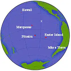 The remaining Essex crewmen, now numbering seventeen in three boats, resumed their journey on December 27 with the intention of reaching Easter Island.[35] On January 4, 1821, they estimated that they had drifted too far south of Easter Island and decided to make for Más Afuera Island off the coast of Chile. On the same day they exhausted their supply of fish and birds from Henderson Island and were back on daily rations of a cup of water and three ounces of bread.[36]