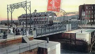 The branch line to Mers was opened to traffic on July 10, 1904.[11] An initial commissioning took place on June 26. However, service was suspended the following day after a three-masted ship damaged the overhead wire supports on the swing bridge connecting the outer harbor to the floating dock at Le Tréport.[11] The extension added over 750 meters to the network and was initially operated only during the summer season. Further negotiations with the municipal authorities of Mers led to an extension to La Prairie, in the town center, which opened on July 2, 1909.[11] This additional 400-meter section brought the total network length to 6,290 meters.[12] Service on the branch line was initially provided at 30-minute intervals, later increasing to 20-minute intervals during the summer. Special departures were scheduled to accommodate the end of performances at the Le Tréport casino.[13]
