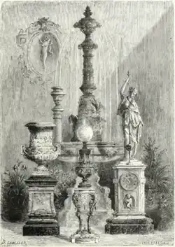 A class of its own among the conical pendulum clocks are the monumental timepieces commercialized between 1862 and 1878. When this model debuted at the London International Exhibition of 1862, it was presented as the first application of the conical pendulum to statuary.[3] In addition to the British capital, this clock was also displayed at the Paris Exposition des beaux-arts appliqués à l'industrie (1863), as well as in the major world's fairs held in Paris (1867 and 1878) and Philadelphia (1876).[4]