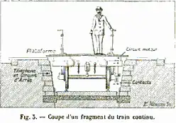 During the planning for the Exposition Universelle (1889) Hénard proposed installing an innovative continuous train system to move visitors around, reducing fatigue and improving flow. The continuous train, or moving sidewalk, would have been powered by electricity.[3][4] His design had a series of 320 wagons forming a continuous loop with a length of 2,080 metres (6,820 ft). They would run through the exposition on rails in a trench. Each wagon would be covered with a wooden floor at ground level, and would move relatively slowly. Young and agile passengers could jump on or off at any point. The train would frequently come to a halt for the convenience of women, children and older passengers.[5]