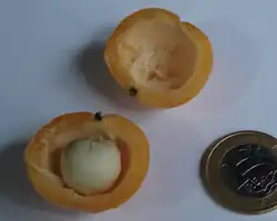 The flowers are white, 15–20 mm (0.6–0.8 in) wide. They occur either alone or in threes, and open between August and September, undergoing both self- and cross-pollination. The fruits (up to 1500 per tree) ripen mostly over a two-month period, between September and December depending on the climate. They fall from the tree when fully ripe, roughly at the start of the rainy season. The fruit is a yellow-orange berry, roughly spherical in shape, with a dry remnant of the calyx opposite to the stem; it is about one inch (2–3 cm or 0.8–1.2 in) in diameter and usually weighs 6–14 grams (0.21–0.49 oz).[3] It has a thin waxy skin and a sweet-sour and slightly astringent pulp, 1–2 mm thick, loosely enclosing one to three round and light gray seeds.