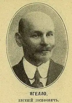 Eugeniusz Jagiełło (Polish pronunciation: [ɛwˈɡɛɲuʂ jaˈɡʲɛwwɔ]; 1873 in Warsaw – 1947 in Warsaw[1]) was a Polish socialist politician, a member of the Polish Socialist Party - Left, elected deputy to the Fourth Duma from the city of Warsaw. The elections to the Warsaw electoral college had been won by Jewish parties, whom mustered 46 electoral votes whilst the non-Jewish bloc gathered 34. However the Jewish bloc decided to elect a Polish Duma member, in an attempt not to inflame anti-semitic feelings towards the Jewish community. Initially the Jewish bloc had approached Kucharzewski, but he declined the nomination. Thus the Jewish bloc had turned to Jagiełło, electing him as the deputy from Warsaw.[2]