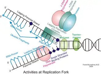 DNA replication is the action of DNA polymerases synthesizing a DNA strand complementary to the original template strand. To synthesize DNA, the double-stranded DNA is unwound by DNA helicases ahead of polymerases, forming a replication fork containing two single-stranded templates. Replication processes permit copying a single DNA double helix into two DNA helices, which are divided into the daughter cells at mitosis. The major enzymatic functions carried out at the replication fork are well conserved from prokaryotes to eukaryotes, but the replication machinery in eukaryotic DNA replication is a much larger complex, coordinating many proteins at the site of replication, forming the replisome.[1]