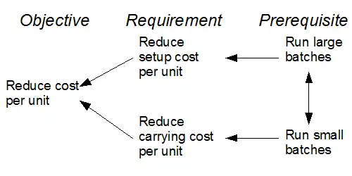 Goldratt has illustrated the use of the evaporating cloud technique in a discussion of the Economic production quantity model.[9]: 43 The prerequisite wants are to run large batches (D) and yet to run small batches (D’). These are clearly in conflict. The required need that D is trying to meet is to reduce setup cost (B), whereas the D’ prerequisite needs to reduce carrying cost per unit (C). Both requirements are aimed at the objective (A): to reduce cost per unit.