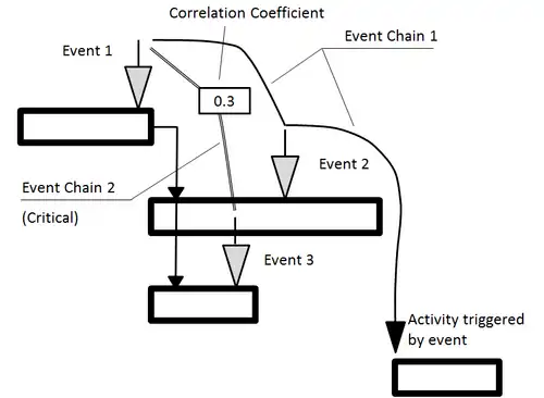 Event chain diagram is a visualization that shows the relationships between events and tasks and how the events affect each other.[11][12] The simplest way to represent these chains is to depict them as arrows associated with certain tasks or time intervals on the Gantt chart. Here are a few important rules: