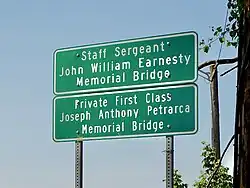 In November 2016, the bridge carrying Brown Street over Jacob's Creek, connecting Scottdale and Everson, was officially named in honor of Staff Sgt. John William Earnesty of Everson and Pfc. Joseph Anthony Petrarca of Scottdale during a public ceremony. Both men, who served in the United States Army, were the only members of their respective communities to be killed in action during the Vietnam War. State Senator Pat Stefano of Connellsville sponsored the legislation to rename the bridge.[8]