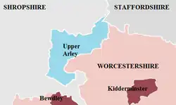 Cradley was also retained by Worcestershire, along with the hamlet of Lutley which was held by the "Canons of Wolverhampton".[35][36] Other anomalies include the status of Bewdley, which was not formally in Worcestershire or Salop in the 15th century (despite being recorded as part of Worcestershire in the 14th Century), thus becoming a focus for criminals fleeing justice in either county. In 1544, Bewdley was formally designated part of Worcestershire.[37][38]