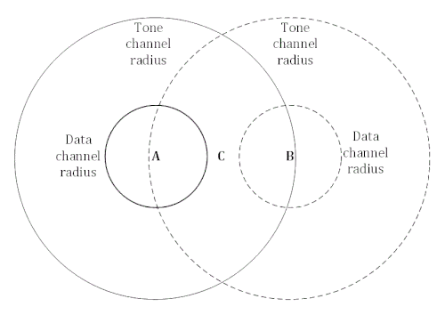 In general, the tone channel bandwidth is quite small compared to the data channel bandwidth. When the two channels have the same transmit power, the communication distance of the tone channel is more than twice that of the data channel. Thus, the tone channel collides before the data channel collides. Since tone channel collisions can be detected, the UE can prevent a data channel collision by selecting another channel resource without collision. This solves the hidden node problem.