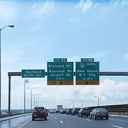 An example of sequentially-numbered exits in Connecticut on the Charter Oak Bridge, Route 15/US 5; the state has begun the federally mandated conversion to mile-based exits.