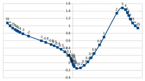 Normalized exponential integral. The value plotted is The values of are written above the corresponding point. The horizontal spacing is according to The graph is extended "beyond infinity" a little on both the right and the left to show how the normalized function behaves when is small. (The horizontal spacing for these points corresponds to angles whose tangent is )