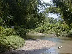 | An exposed shoal. | An intermittent braided water course showing fluvial deposits. | A sand bar and the opposite bank. |