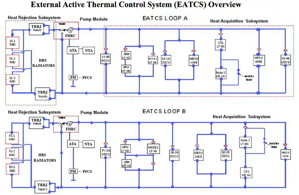 The International Space Station (ISS) External Active Thermal Control System (EATCS)[1] maintains an equilibrium when the ISS environment or heat loads exceed the capabilities of the Passive Thermal Control System (PTCS). Note Elements of the PTCS are external surface materials, insulation such as Multi-Layer Insulation (MLI), or Heat Pipes. The EATCS provides heat rejection capabilities for all the U.S. pressurized modules, the Japanese Experiment Module (JEM), the Columbus Orbital Facility (COF), and the main power distribution electronics of the S0, S1 and P1 Trusses. The EATCS consists of two independent Loops (Loop A & Loop B), which both use mechanically pumped fluid state ammonia in closed-loop circuits. The EATCS is capable of rejecting up to 70 kW, and provides a substantial upgrade in heat rejection capacity from the 14 kW capability of the Early External Active Thermal Control System (EEATCS) via the Early Ammonia Servicer (EAS), which was launched on STS-105 and installed onto the P6 Truss.[1]