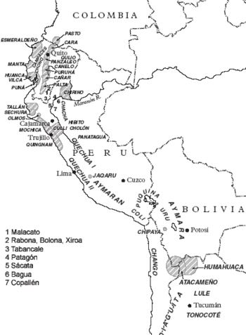 Chacha is the name sometimes given to the language of the Chachapoya culture.[2] The Chachapoya, originally from the region of Kuelap to the east of the Marañón, were conquered by the Inca shortly before the Spanish conquest, and many were deported after the Inca Civil War. They sided with the Spanish and achieved independence for a time, but were then deported again by the Spanish, where most died of introduced disease. Their language is essentially unattested apart from toponyms and several hundred family names. Family names are mostly short and have been distorted through adaptation to Quechua; the only one which can be identified is Oc or Occ [ox], which according to oral history means 'puma' or 'bear' (Adelaar 2004:407). It may have been Cahuapanan.[3]