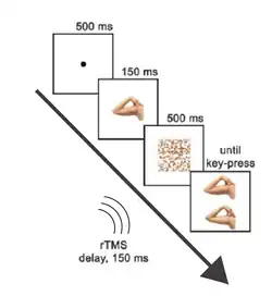 The actual experiment had people make a “two-choice matching-to-sample task. Fourteen right handed participants were required to decide which of two similar upper-limb images matched a single sample previously seen during a tachistoscopic exposure. Photos of face parts and motorcycle parts served as control stimuli in two-matching-to-sample tasks that were comparable to the former task.”[5] rTMS was then applied 150 ms after each sample exposure. The section of the graph, Body Parts, shows the response time while using rTMS. The SHAM category refers to measuring the EBA without rTMS while viewing the images. The Visual Cortex category measures the response of the FFA to be used as the control of the experiment. This measurement of response time, occurring while rTMS was effecting the EBA, further shows that the two areas process visual data of the human form, yet respond to different stimuli. While the magnetic stimulation was temporarily disabling the extrastriate body area, reaction time decreased by about 100 ms. The data from the Sham and Visual Cortex categories on the graph show what was the expected normal results from the experiment. This evidence reveals that applying rTMS to the EBA slowed the response of recognizing images of body parts.[5]