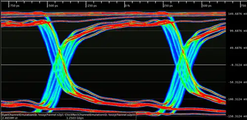 The image below shows a 1.25 Gbit/s NRZ signal after passing through a lossy channel – an RG-188 coaxial cable approximately 12 feet (3.7 m) in length. This channel has loss increasing in a fairly linear fashion from 0.1 dB at DC to 9 dB at 6 GHz.