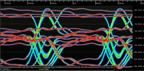 In the image below, an additional three inches of cable is added to the end of the same stub. The same "step" is present but is now four times as long, producing reflections at about 1280 ps or 1.6 UI. This produces extreme ISI (since the reflection of each UI arrives during the subsequent UI) which completely closes the eye.