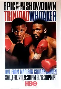A fight between Trinidad and Whitaker had been in the works for several years. In 1995, both fighters had appeared in a doubleheader event billed as Collision Course in which IBF welterweight champion Trinidad would defeat his mandatory challenger Larry Barnes, while Whitaker, then the WBC welterweight champion, would defeat his mandatory challenger Jake Rodriguez. Following their victories, initial plans called for a unification bout in which both fighters' titles would be on the line with both fighters expressing hopes for the fight to happen the following year in 1996 during the post-fight press conference.[1] Whitaker had begun training for his expected fight against Trinidad in April 1996, but the following month, negotiations between Whitaker's promoter Dino Duva and Trinidad's promoter Don King had reached an impasse largely due to a dispute between HBO, who had an exclusive contract with Whitaker, and Showtime, who usually broadcast fights featuring King's fighters, and the fight was called off.[2]