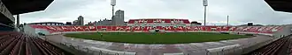 The Čair stadium began undergoing complete reconstruction during the second half of 2011 in an ambitious project by the Football Association of Serbia and the city of Niš. The project included the renovation of eastern, southern and northern stands. When reconstruction was finished, the stadium's seating capacity had been increased to 18,151 spectators, including an additional VIP lounge with 120 seats and a media lodge with 50 seats. The project also entailed covering the whole stadium, new floodlights and LED, a new locker room and press room, new infirmaries, a parking area, ticket offices, a restaurant and a TV room for broadcasts. After reconstruction, the stadium fulfilled the most up to date UEFA standards.[4] The cost of the project was estimated to be over 1.1 billion Serbian dinars (10 million euros).[5]