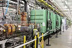 In February 2019, FRIB accelerated beams through the first 15 (of 46 total) cryomodules to 10 percent of FRIB's final beam energy.[13] In August 2019, the radio-frequency quadrupole (RFQ) was conditioned above 100 kW, the CW power needed to achieve the FRIB mission goal of accelerating uranium beams. The RFQ prepares the beam for further acceleration in the linac.