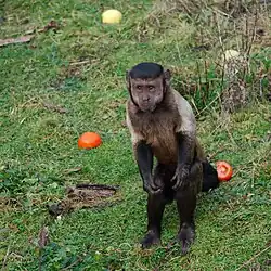 Capuchin monkeys are arboreal quadrupeds, but can locomote bipedally on the ground.[15] They use a spring-like walk that lacks an aerial phase.[15] While humans employ a pendulum-like gait which allows for the interchange of kinetic and potential energy, capuchins do not.[15] This means the energy costs of bipedalism in capuchins is very high. It is thought that the reduced energetic costs of a pendulum-like gait (such as in humans) are what led to the evolution of obligate bipedalism.[15]