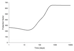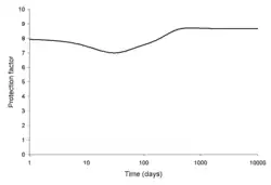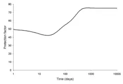 The protection factor provided by 30 cm of concrete shielding where the source is the idealised Chernobyl fallout.[45]