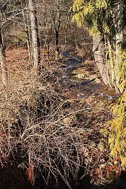 In the higher elevations of the watershed of Fallow Hollow, the forest canopy consists of trees such as red maple, sugar maple, red oak, white oak, yellow birch, serviceberry, Eastern hemlock, and big-tooth aspen. The understory of this part of the watershed is inhabited by plants such as northern lady fern, hay-scented fern, New York fern, common wood fern, and starflower.[7]