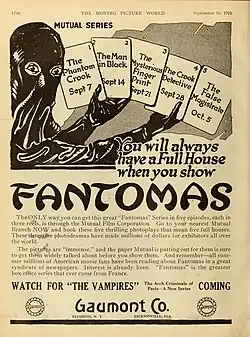 Fantômas (pronounced [fɑ̃toˈmas]) is a French silent crime film serial directed by Louis Feuillade, based on the novel of the same name.[1] The five episodes, initially released throughout 1913–14, were restored under the direction of Jacques Champreaux and re-released in 2006.