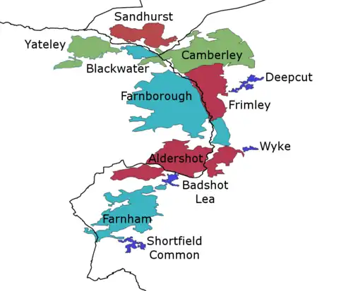 Most of the conurbation lies alongside the River Blackwater which gives a wider area including Fleet (which is not geographically in the Blackwater Valley) the alternate name of Blackwater Valley.[4]