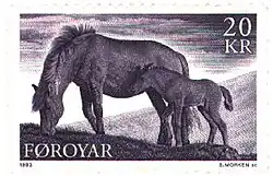 The Faroe pony (Faroese: føroyska rossið) is a small but strong pony. Its height is between 115–125 centimetres (45–49 in). In the old days it was used as a work horse, carrying heavy loads, but now it’s mostly used as a child’s riding horse. In the early 1900, a lot of ponies were exported to be used as pit ponies. In the 1960s, there were 5-6 pure ponies left; now, with huge effort, there are 73 ponies.[1]